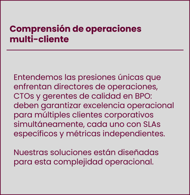 Ayudamos a las BPO a convertirse en "plataformas tecnológicas inteligentes" que gestionan millones de interacciones, manteniendo escalabilidad dinámica, calidad certificada y segregación total entre cuentas.