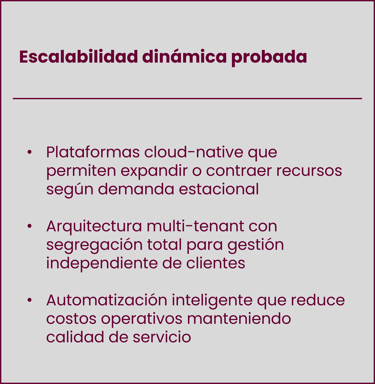 Soluciones que permiten expandir o contraer operaciones según demanda, apoyando en la personalización e integraciones que cada BPO requiere.