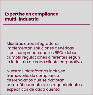 Frameworks de compliance diferenciados según regulaciones específicas de cada industria atendida.